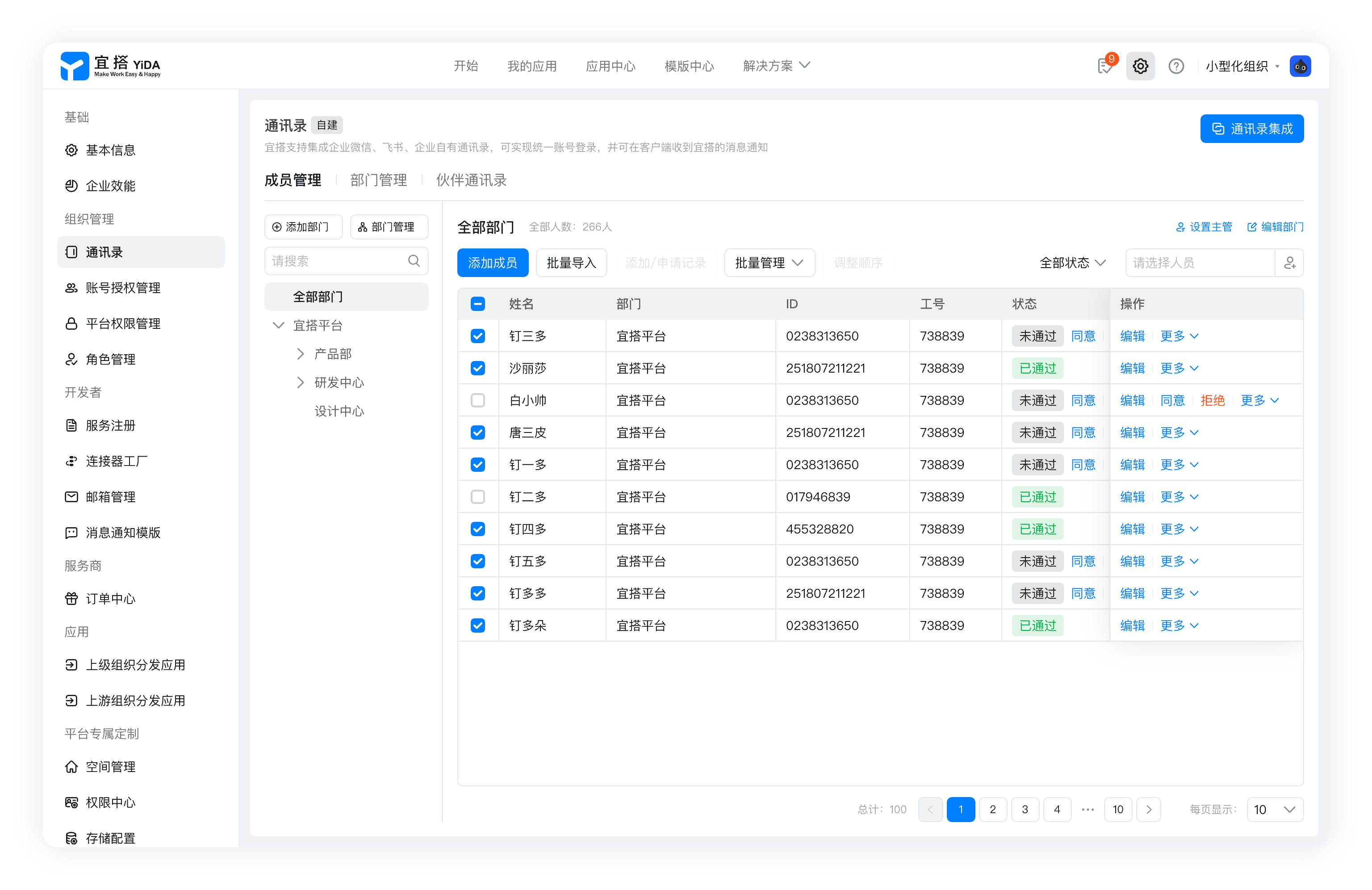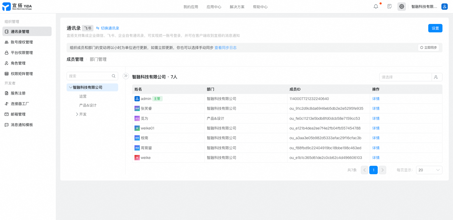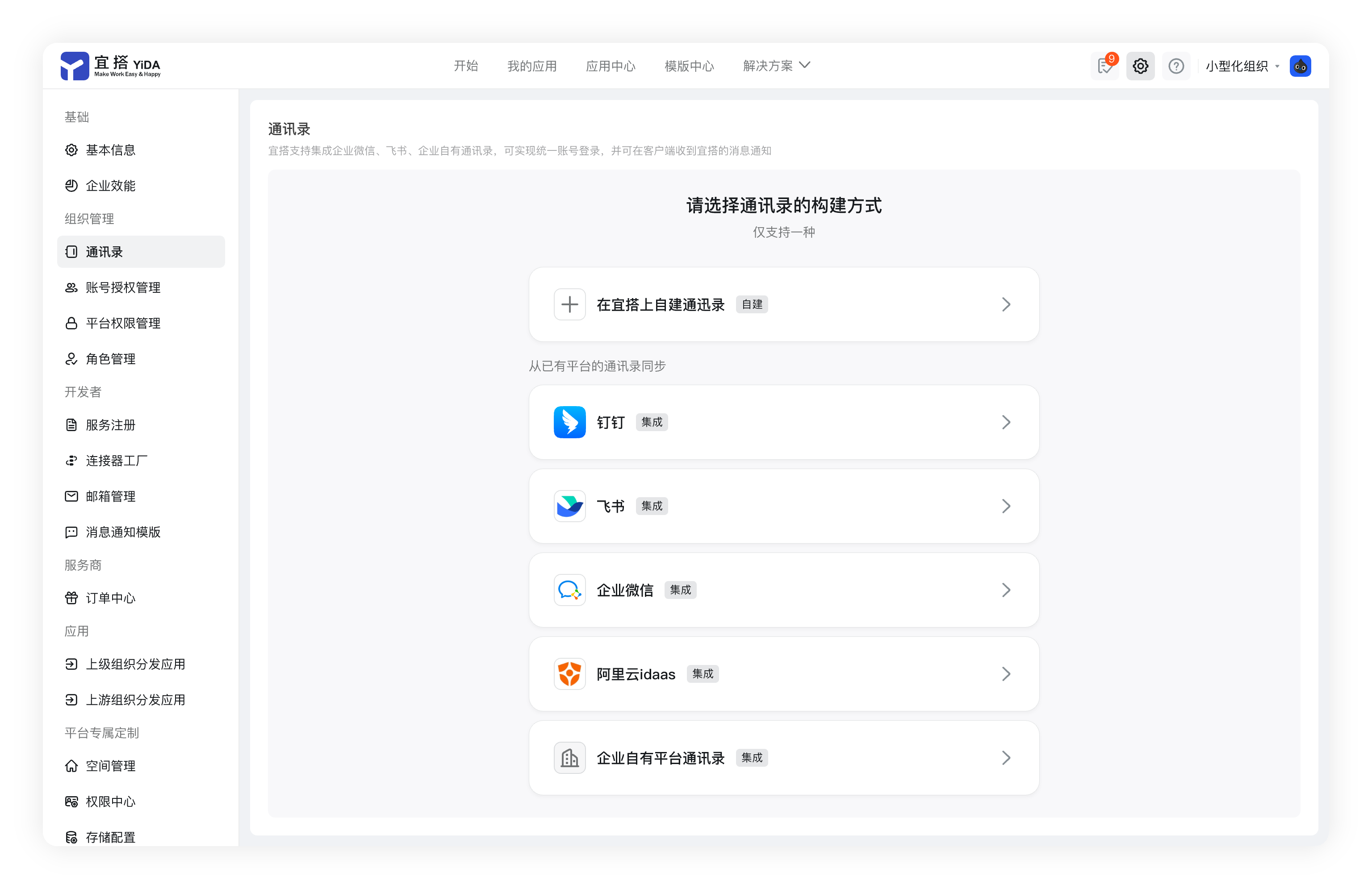 支持自建通讯录及集成钉钉、飞书、企业微信、IDAAS及企业自有通讯,支持消息和统一登录,无缝打通适配不同IM底座,满足多生态客户需求;