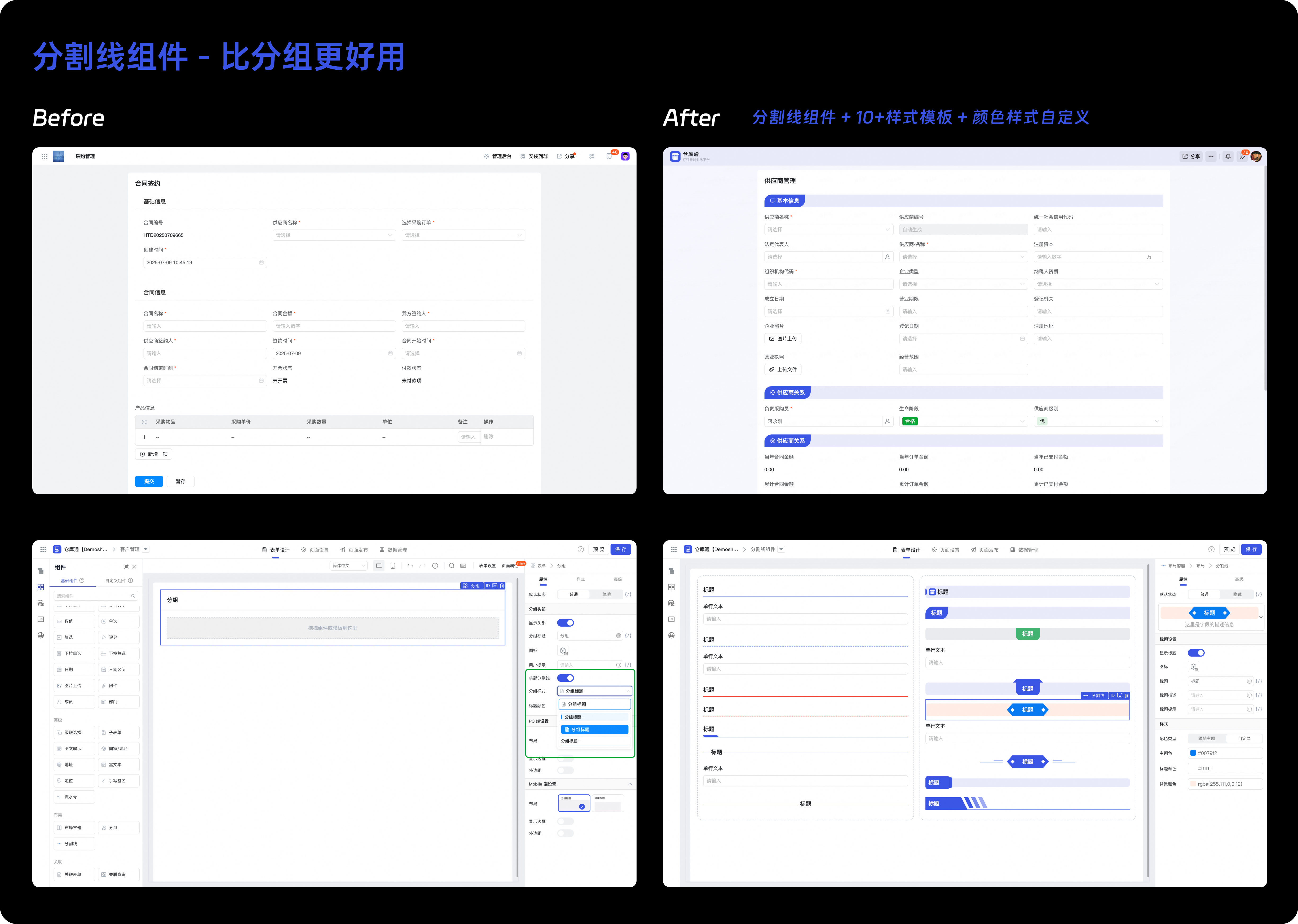 2、比分组更好用表单分割线: 10+种分割线,颜色自定义,让表单视觉默认美好、样式丰富,并且比分组更好用 | ![]() |