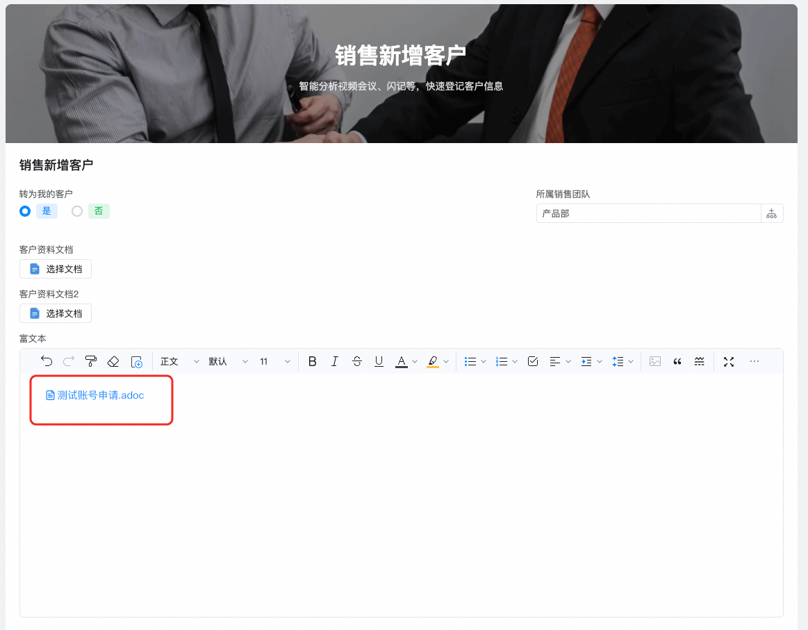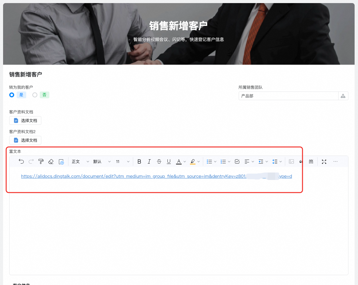 2. 富文本组件:钉钉文档链接,支持自动识别